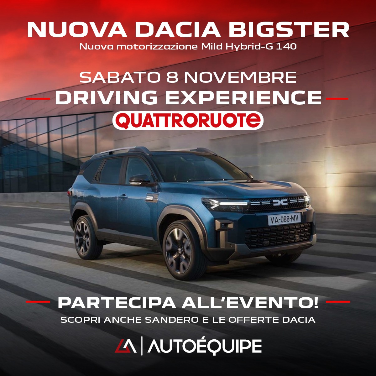Sabato 8 Novembre vivi un’esperienza esclusiva e scopri la nuova motorizzazione Mild Hybrid-G di Dacia Bigster, il SUV che ridefinisce il concetto di libertà e versatilità, insieme ai Driver Professionisti di Quattroruote!
